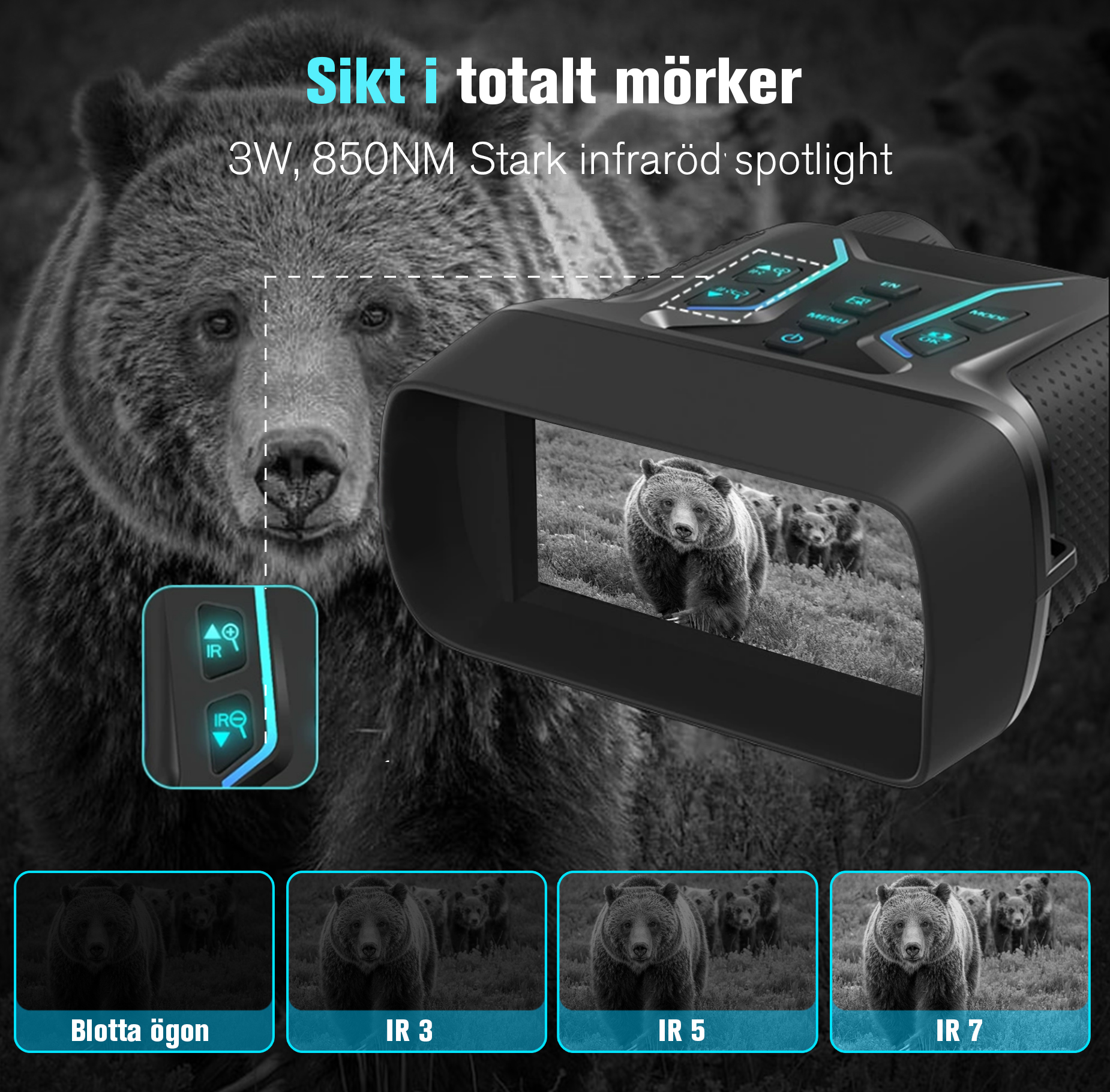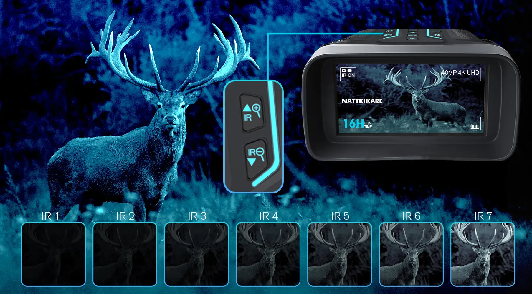 • 7 justerbara IR-nivåer för optimal mörkerseende.