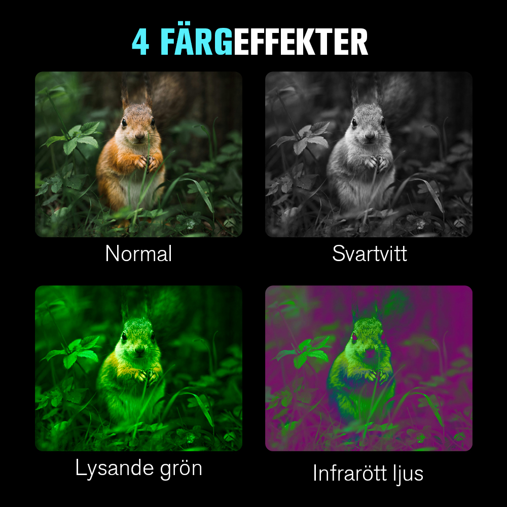 Resultaten är verkligen fantastiska! Både infrarött och linsens ljuskänslighet är utmärkt. Med den digitala zoomen kan man till och med identifiera en kanin på 100 meters avstånd i totalt mörker. Enheten känns robust att hålla i och skärmen är av god kvalitet.