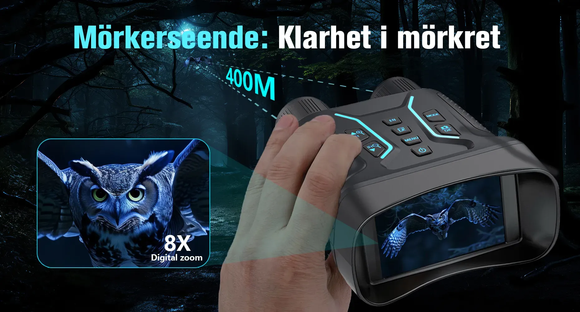 Denna mörkerkikare med 8x digital zoom gör att du tydligt kan ta närbilder av avlägsna objekt. Dess zoomfunktion säkerställer ökad synlighet och förstoring vid övervakning eller observation av vilda djur.